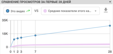 Доступна статистика по первым часам или после 1,2,3 и 28 дней. Уникальная информация, которая поможет соотнести данные своего канала и любого другого.