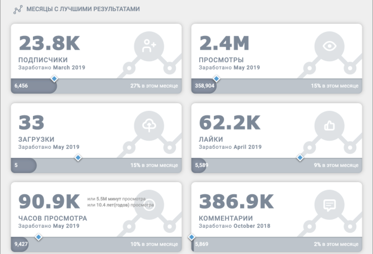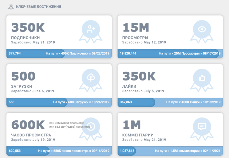 Есть возможность скачать или поделиться достижениями по подписчикам, просмотрам, загрузкам, лайкам, часам просмотра или комментариям.