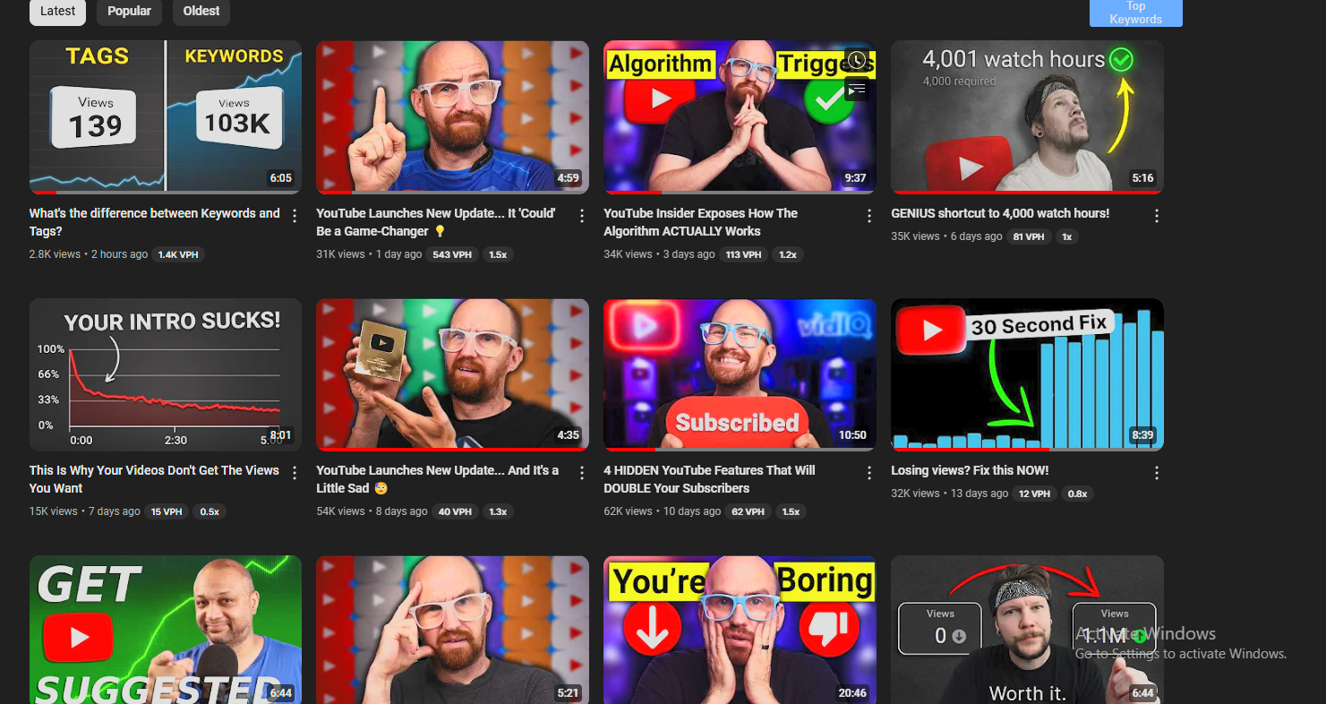 For example, this is how the vidIQ channel home page looks at first glance. As you can see, there is homogeneity in the way we use our creators faces and other graphical elements across videos./